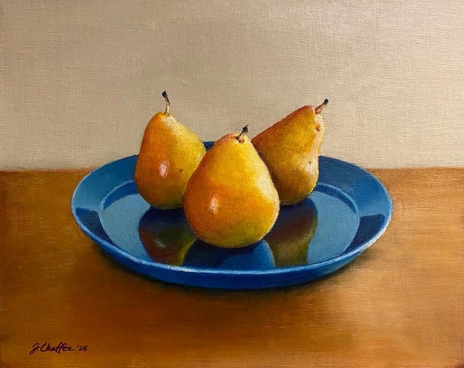 Little Forelle Pears on a Blue Plate, Oil on Linen, 8" x 10"