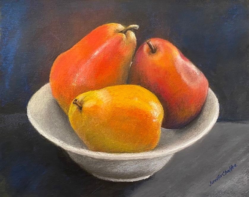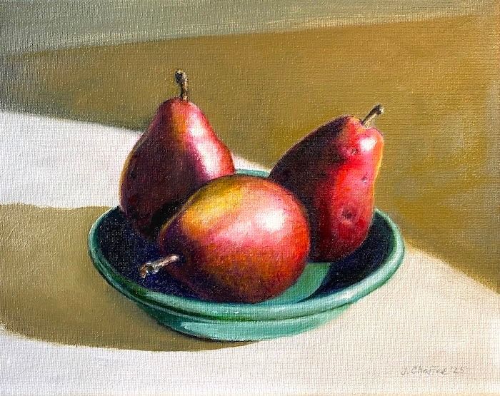 Red D'Anjou Pears in Green Dish, Oil on Canvas, 8" x 10"